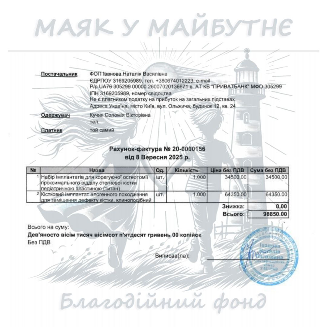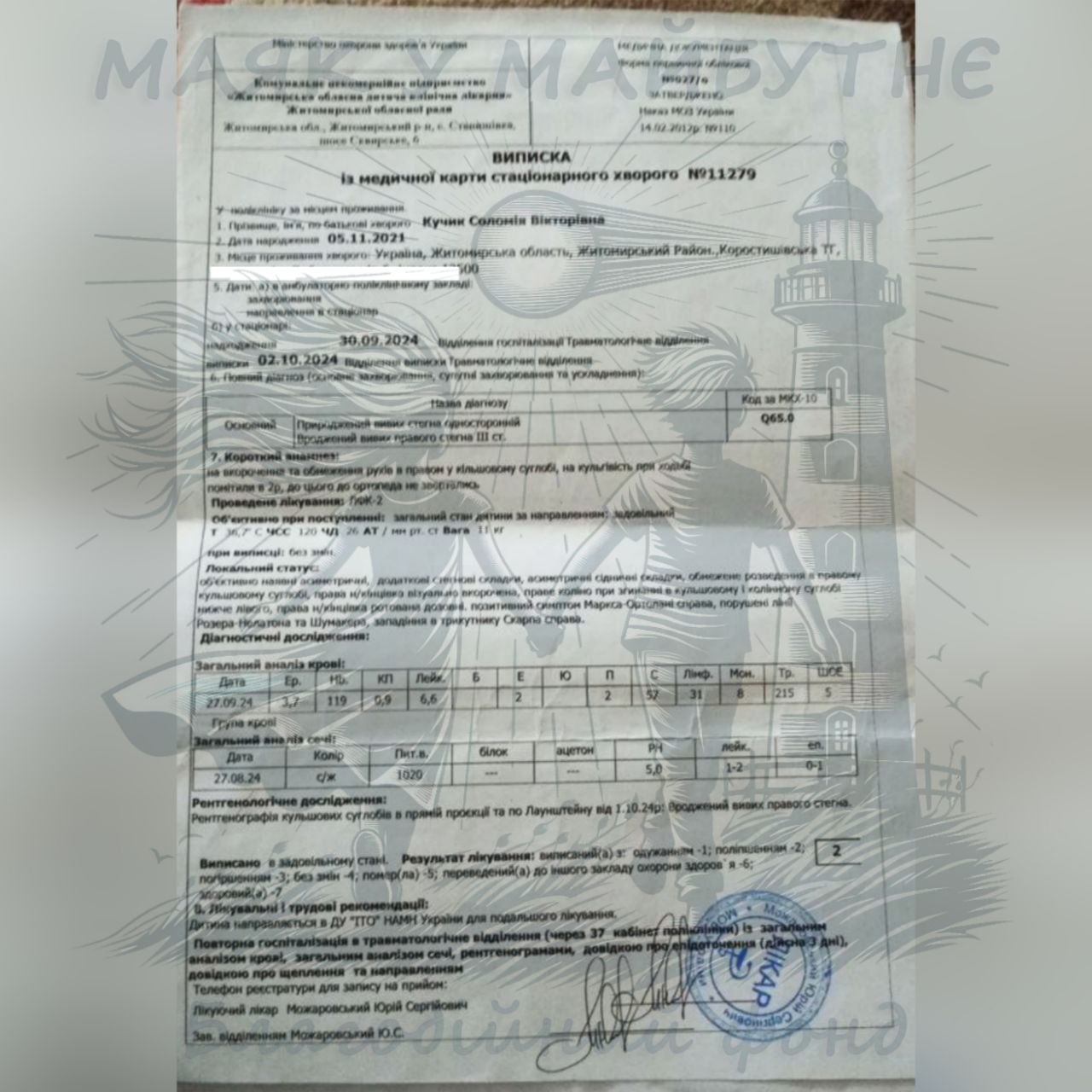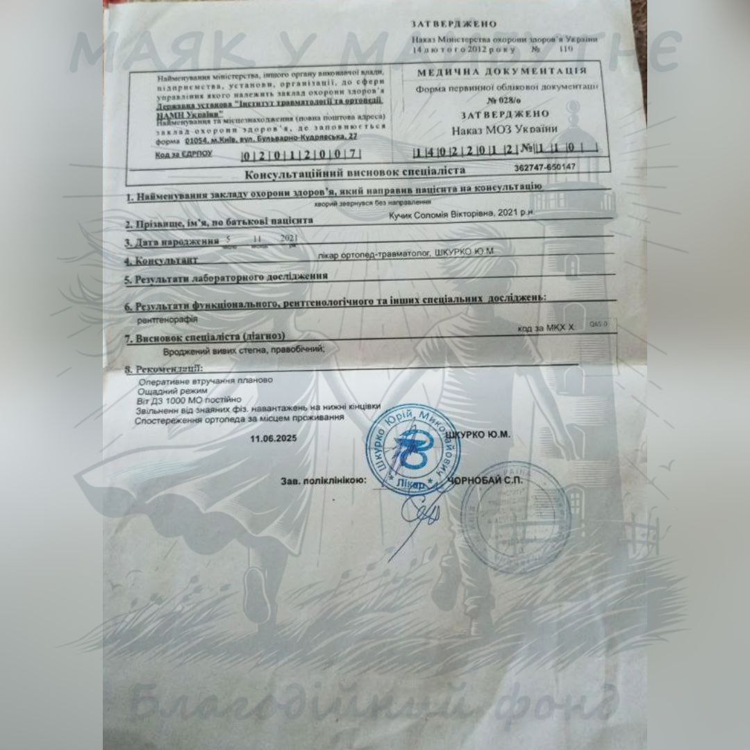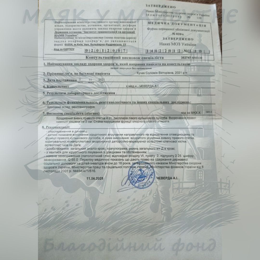 Лікарі призначили Соломії планову ортопедичну операцію вже на листопад цього року. Це її шанс зберегти здоров’я, відновити правильну роботу суглобів і рости без болю.