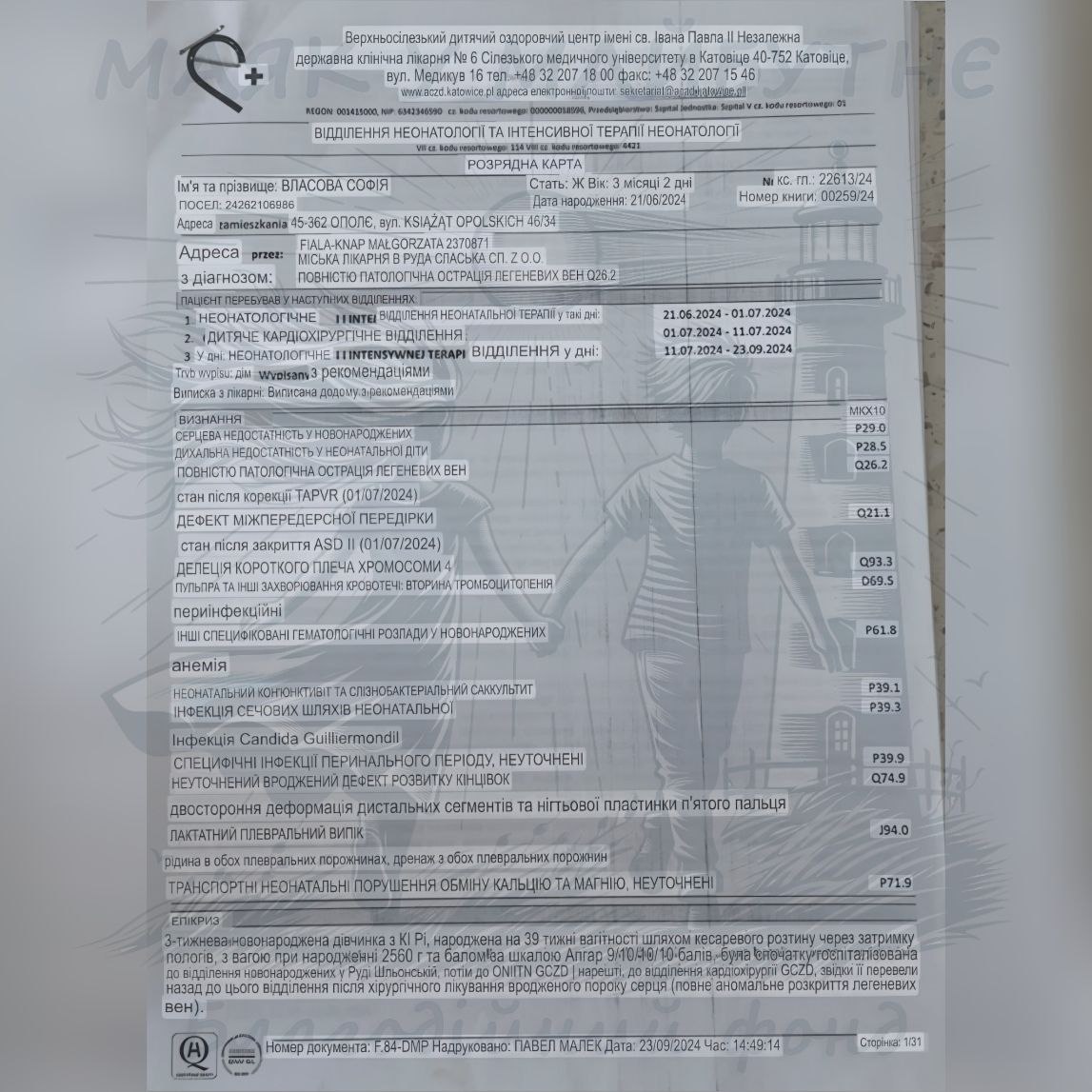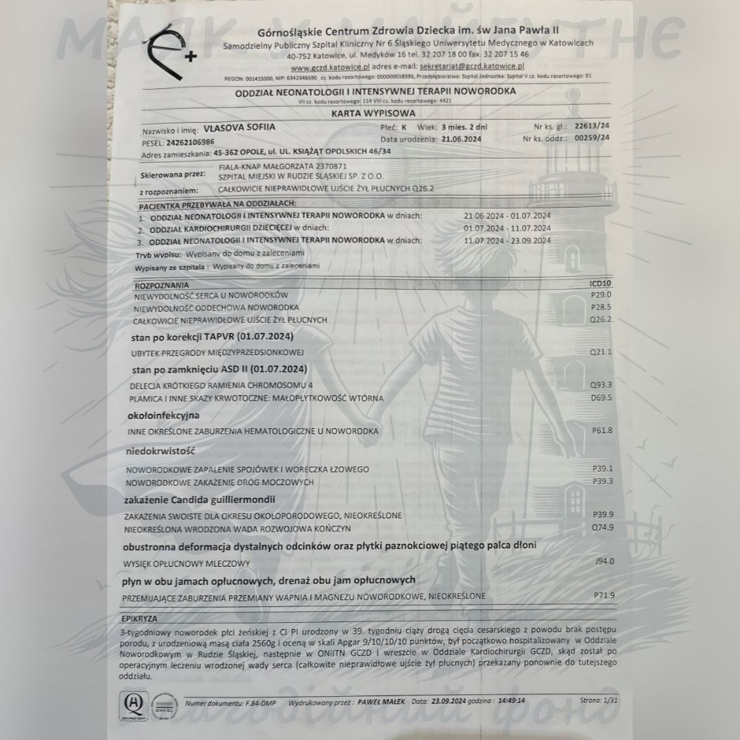Дівчинка народилася з важкою вадою серця. Одразу після народження їй провели надскладну операцію — тотальний аномальний дренаж легеневих вен. Після цього Софія три місяці жила, підключена до апарату штучної вентиляції легень. Кожен день був на межі життя і смерті. І диво сталося — Софійка вижила. Сьогодні їй 1 рік і 7 місяців, і вона поруч зі своєю матусею.