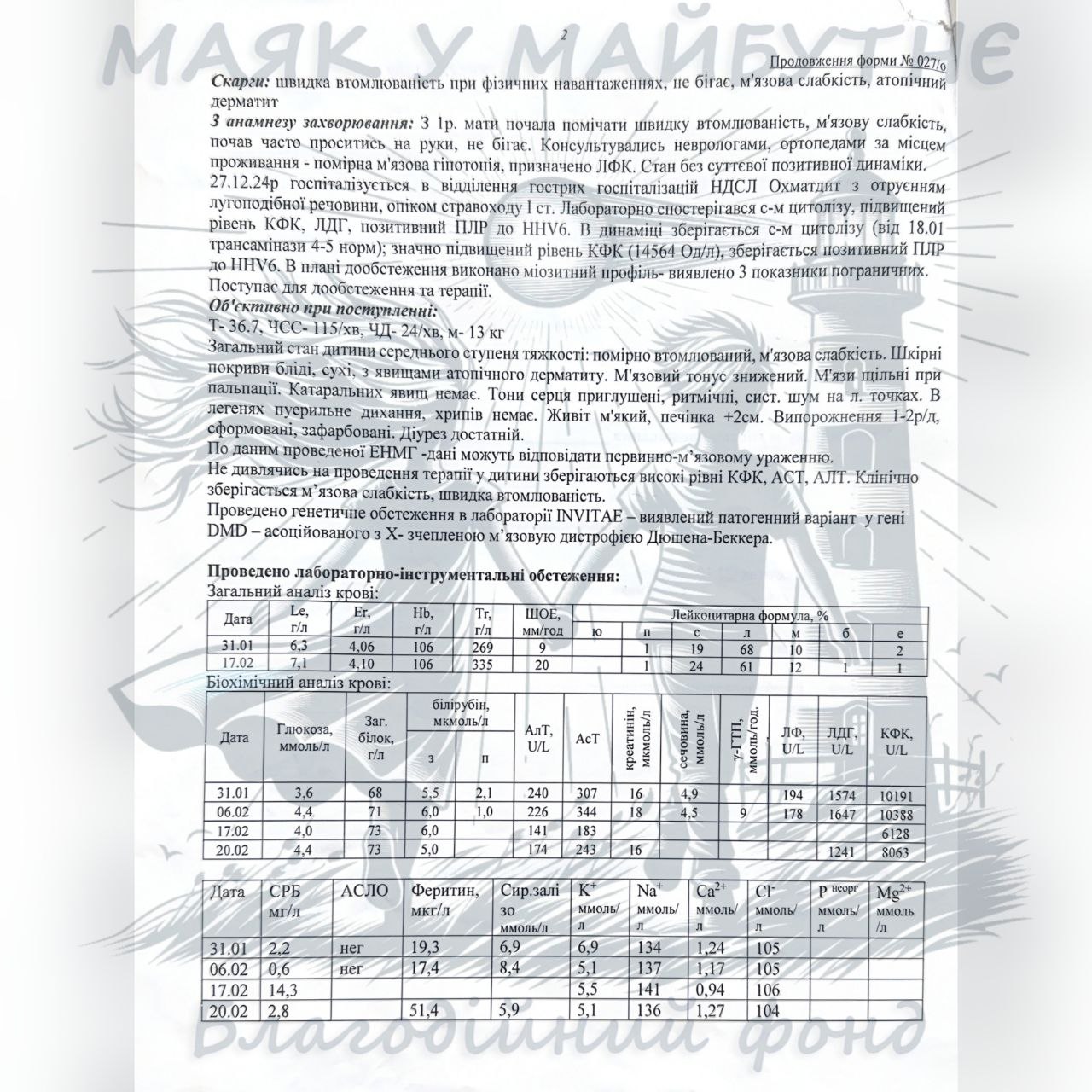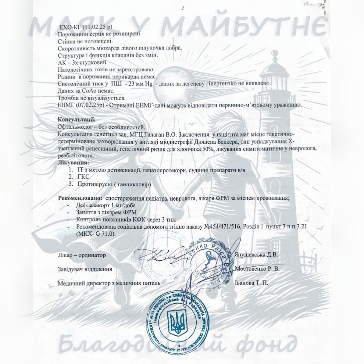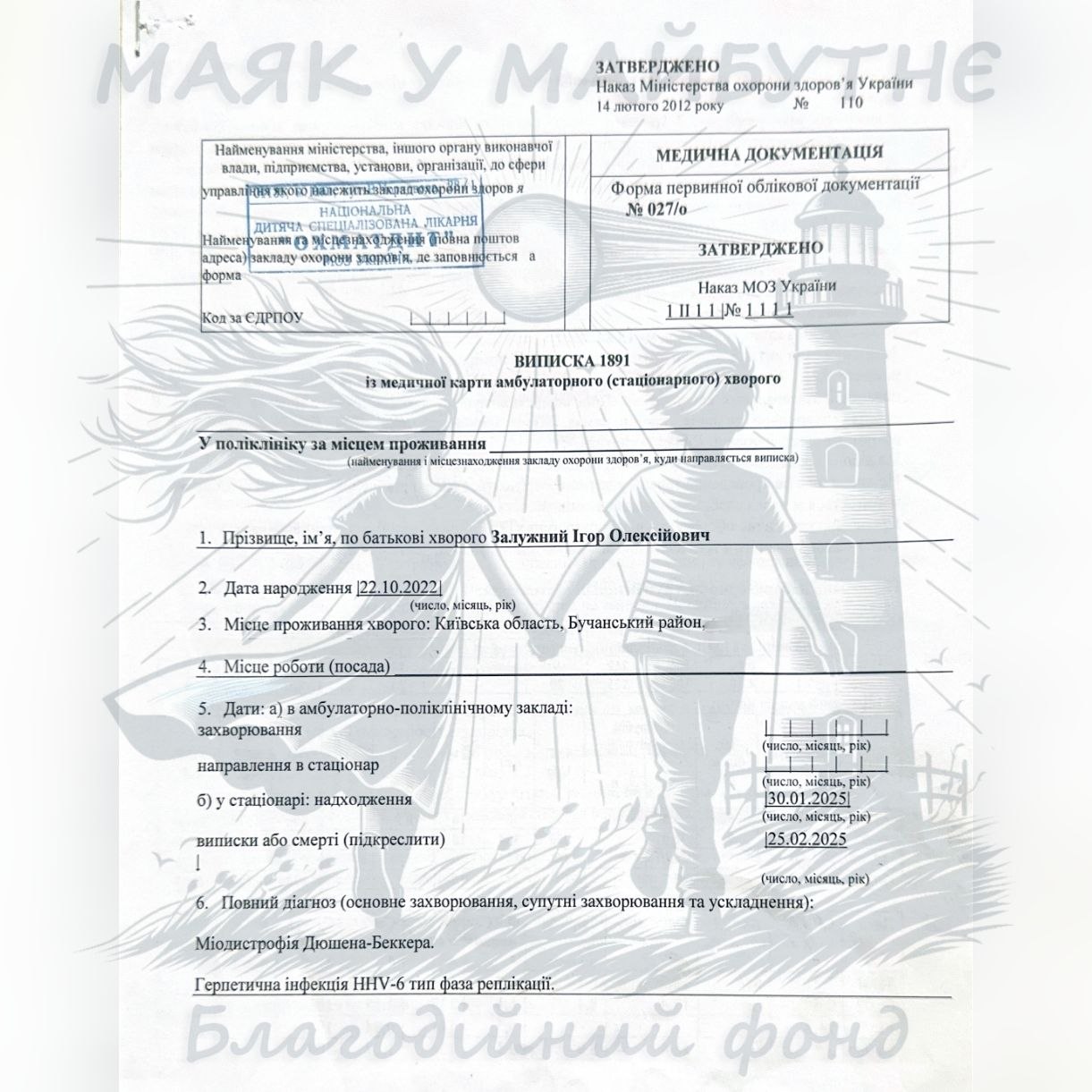 Родина Залужних із Гостомеля пережила окупацію, війну та болісну розлуку. Здавалося б, найстрашніше вже позаду. Але справжнє випробування чекало попереду — їхньому маленькому синові Ігорю поставили діагноз, який лякає кожного з батьків: М’язова дистрофія Дюшена. Це рідкісне генетичне захворювання поступово руйнує м’язи дитини. Ще сьогодні Ігор усміхається, грається і мріє, як усі діти. Але без лікування вже у 8–10 років такі діти втрачають можливість ходити, а згодом потребують підтримки дихання.